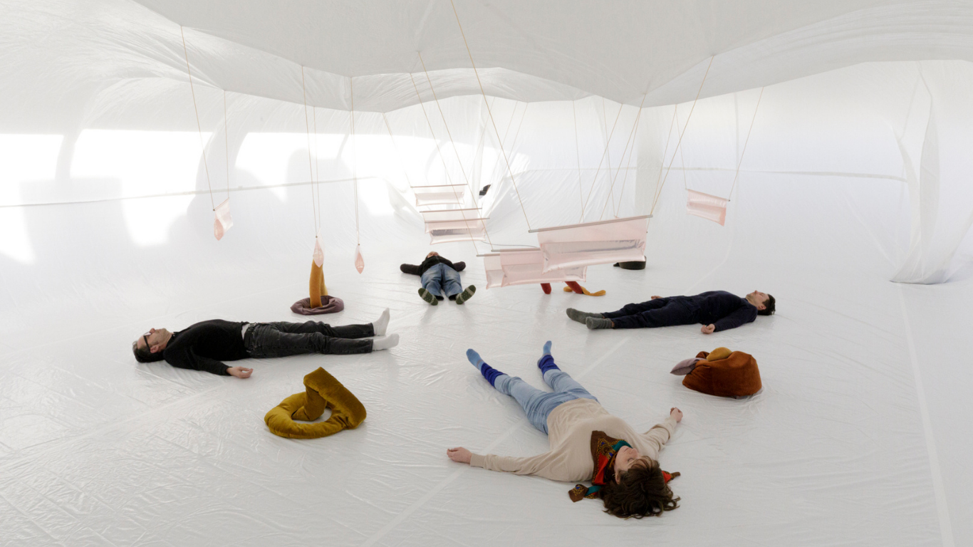 Stap in de witte, kathedraalachtige ruimte, gedragen door lucht. Nauwelijks merkbaar wordt de ruimte kleiner, komen objecten dichterbij en landen ze op je lichaam. Wat volgt is een tedere aanraking. Niet door een mens, maar iets anders. Terwijl de ruimte weer wordt opgeblazen en de objecten terugkeren naar hun uitgangspositie, voel je je vastgehouden, opgetild en ben je in het moment bewust geworden van je lichaam.